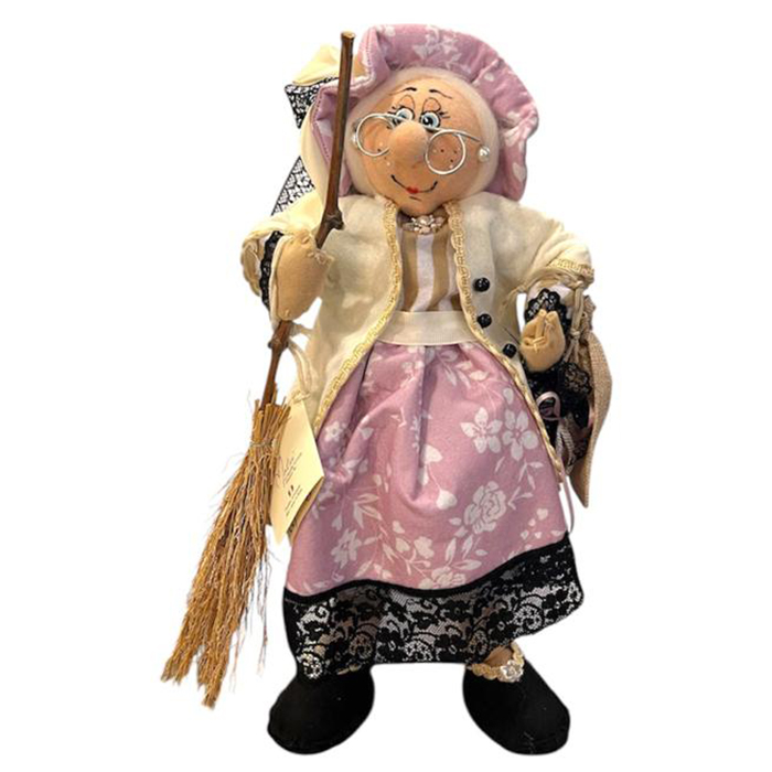 Befana interamente realizzata a mano in Italia. Altezza di 42 cm. Dotata di scopa, ombrello, orecchini di perle e spilla gioiello.